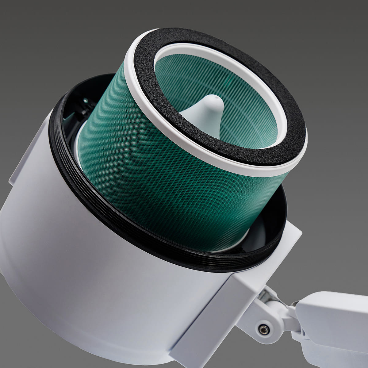 Центробежный двигатель с производительностью 936 м³/ч и фильтр Green Fiber задерживают 99,99% пыли и аллергенов, обеспечивая безопасную концентрацию воздуха в 3,5 раза ниже норм ВОЗ.